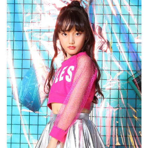 チアガール衣装 2点セット 長袖シャツとミニスカート オーガンジー 英字 プリントシャツ メタリックスカート 女の子 子供服 キッズ シルバー/ピンク 120cm 130cm 140cm 150cm 160cm ダンス衣装 ヒップホップ イベント衣装 発表会 ステージ衣装