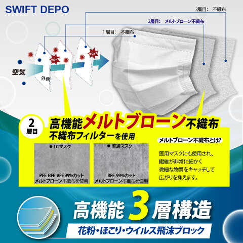 100%日本製の不織布マスク 医療グレードのメルトブローン不織布使用 【カケンテストセンター試験済み】 ・BFE試験:細菌を含む飛沫99%カット ・VFE試験:ウイルスを含む飛沫99%カット ・PFE試験:微粒子(0.0001mm=0.1μm)99%カット ・花粉捕集効率試験:花粉99%カット クリーンルーム環境にて製造されております。